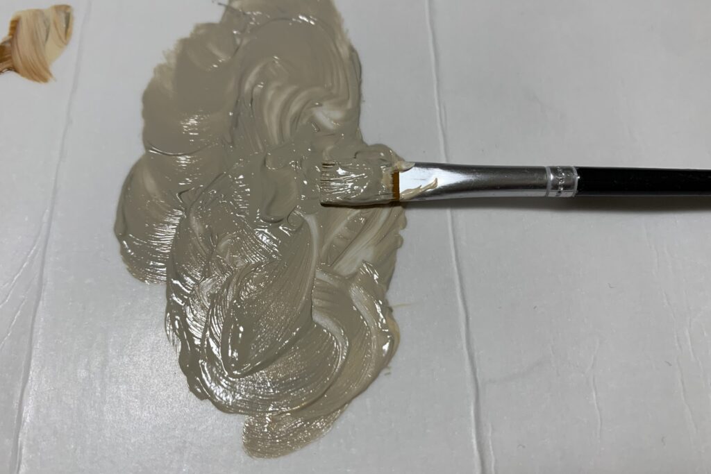 次にマッチした2種類のクリームをパレットに出し、ブラシを使って少しずつ混ぜ合わせて同じ色に近づけていきます。