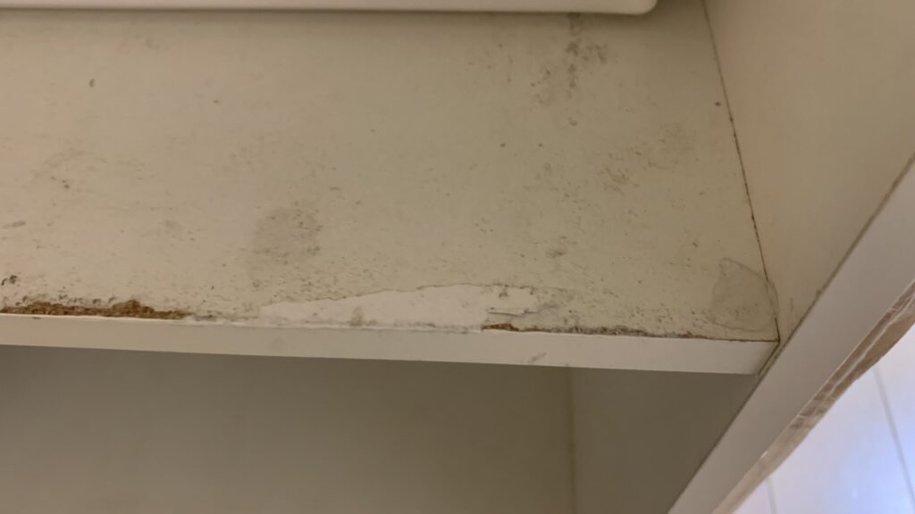 除菌シートでゴシゴシ拭いてもカビはなかなか取りきれない。思い切って取り外したものの、モノが後ろに落ちてしまう…。