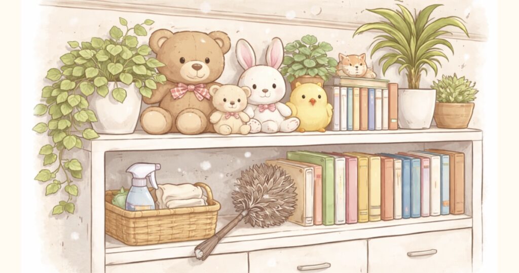 ⚫︎ 棚に並べた飾りや本を1コ1コ持ち上げながら拭く