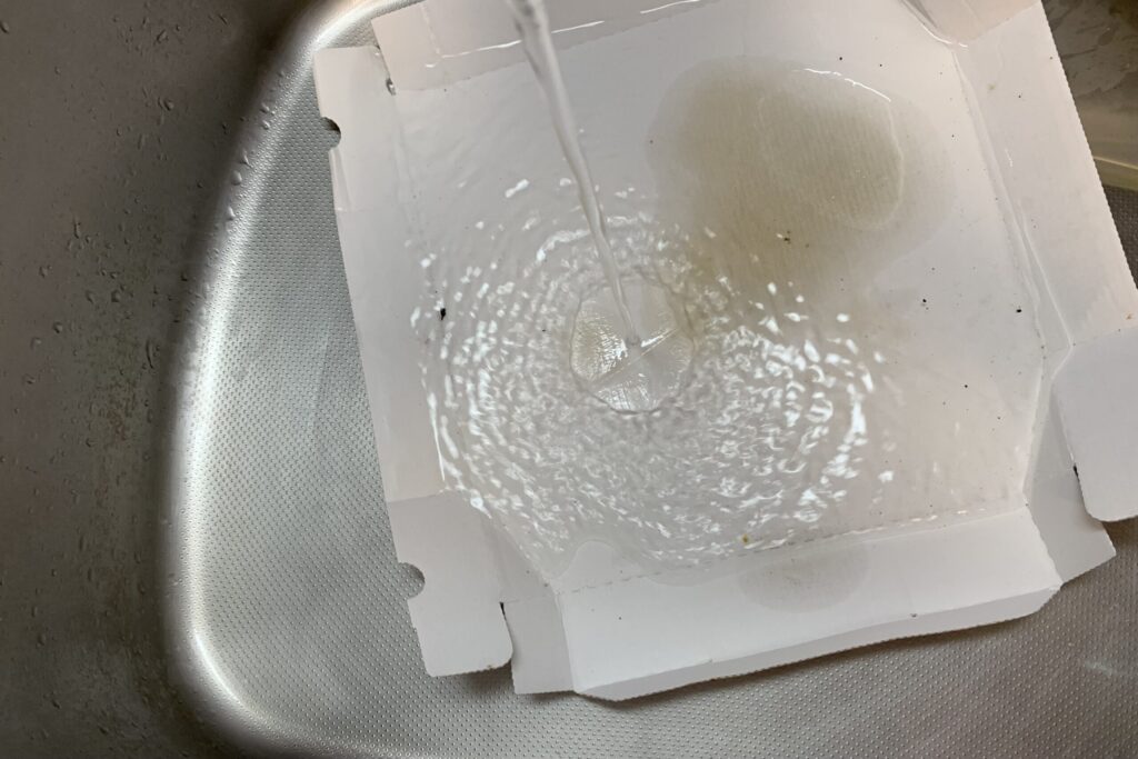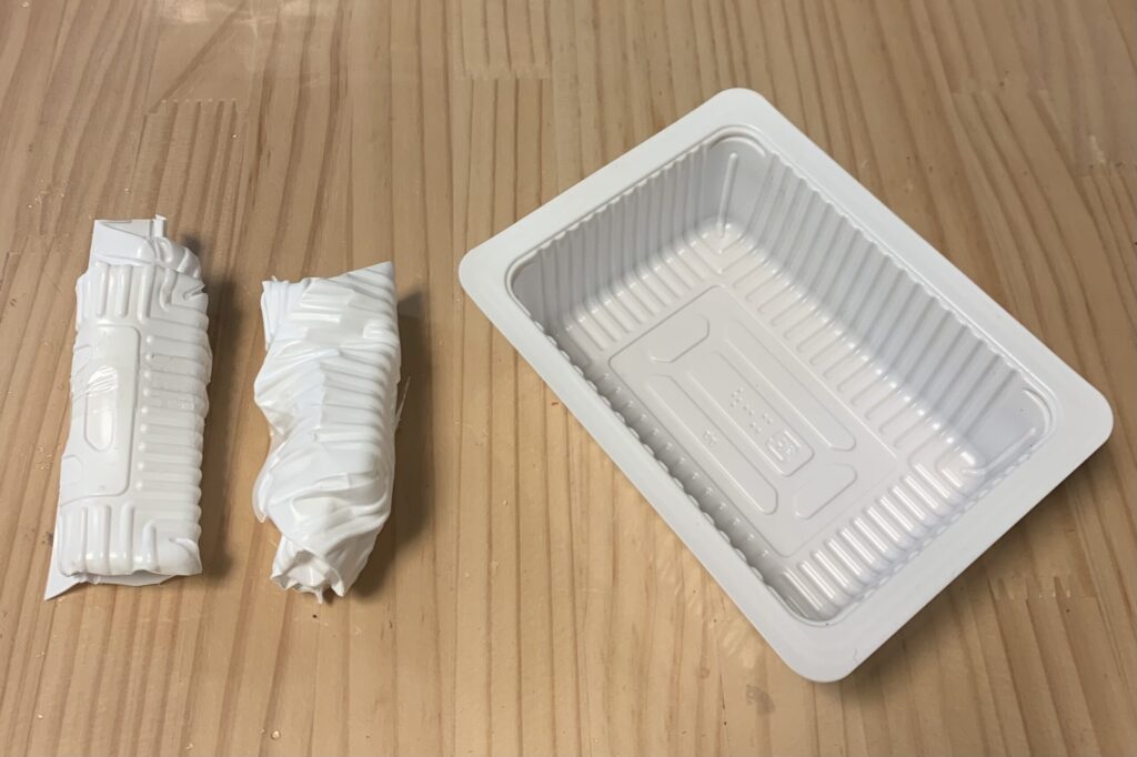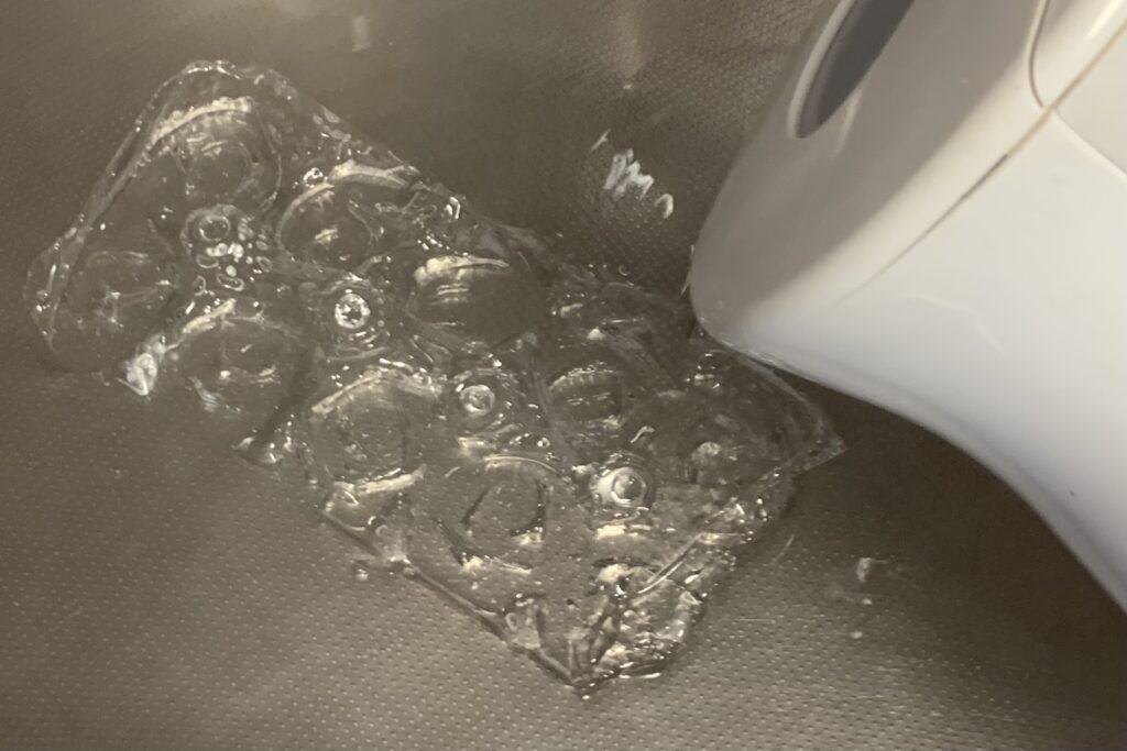 つぶすのがむずかしい硬いプラゴミも、熱湯で柔らかくしてペタンコにできます。