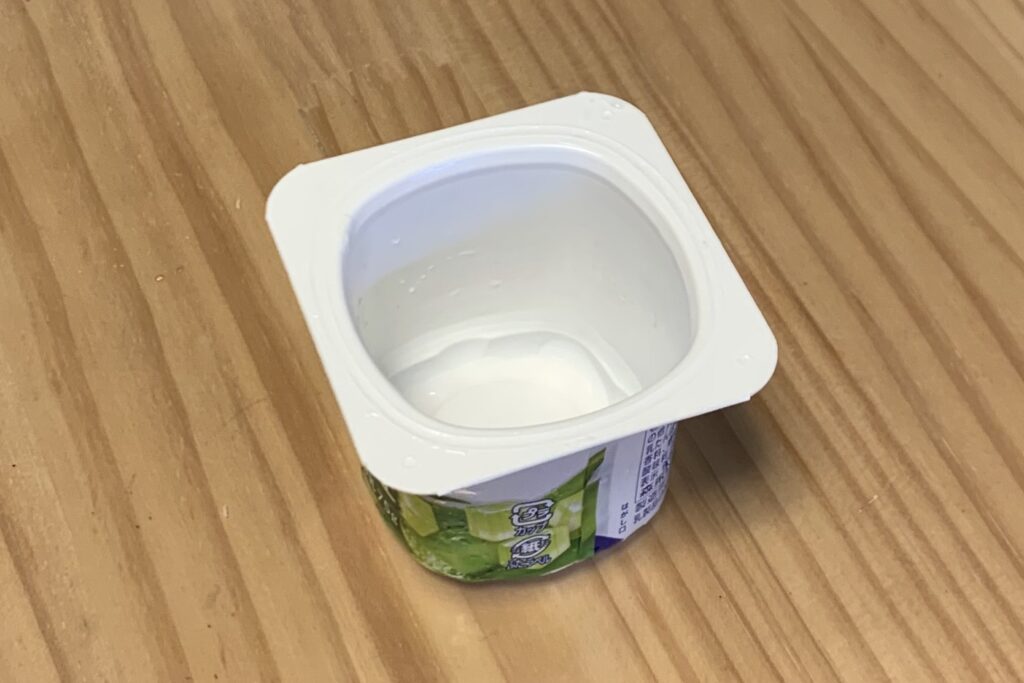 高さのある柔らかめのプラ容器は、掌を使って「えいっ!」と押しつぶします。