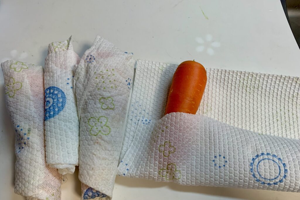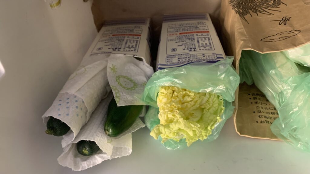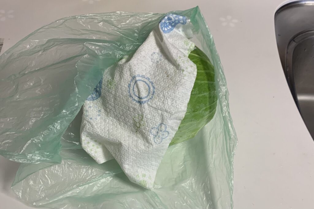 野菜に水滴が付いていたら、キッチンペーパーで覆ったり、拭き取ってから保存します。