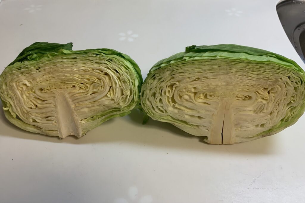 ⚫︎ 丸ごとキャベツを半分にカットして、一方は丸裸のまま、もう一方は長持ちする方法で保存する。