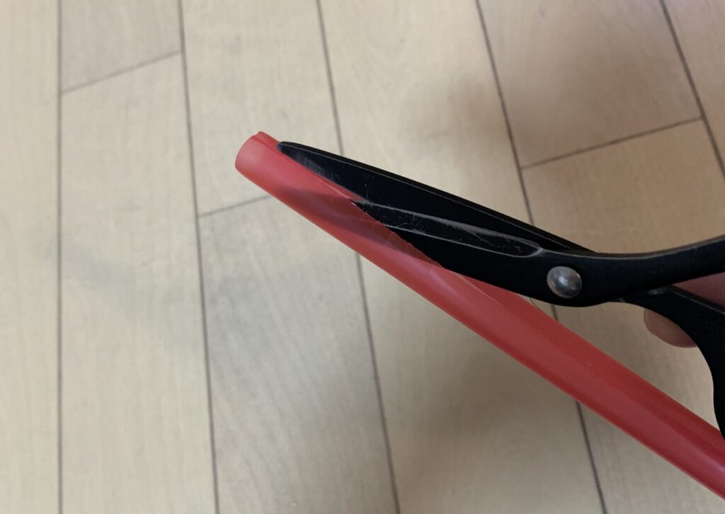 ② ストローに切り込みを入れて、下側のバーにはめる。