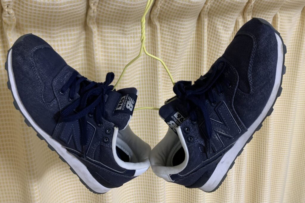 ② ハンガーの両端に、靴を片方ずつ差し込んで干す。