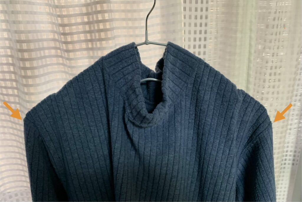 ② ハンガーの跡が付かないように、ハンガーの先端と服の肩の縫い目部分が合うように掛ける。