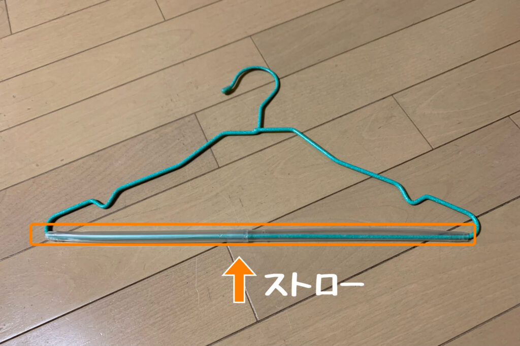 ワイヤーハンガーにズボンを掛けて収納する場合は、太めのストローを使うと、折り目が付きにくくなって◎