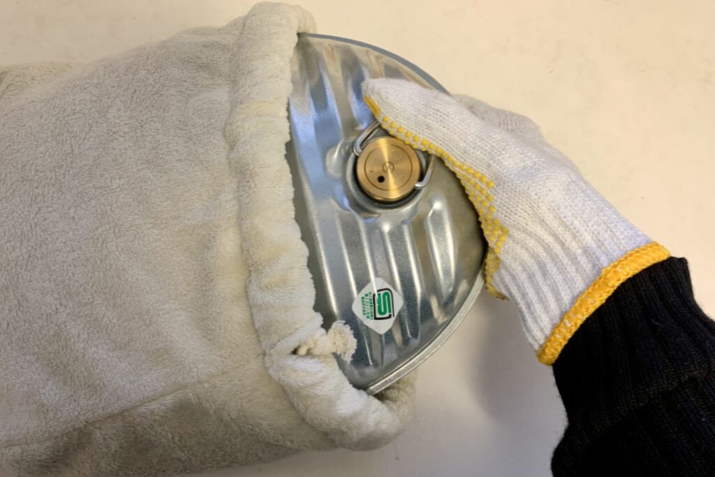 熱々になった湯たんぽを、火傷をしないように軍手や耐熱用のミトンを使いながら、袋に入れたりバスタオルなどで包みます。
